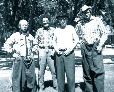 During his tenure as president of the Garfield County Frontier Fair Association, which was the governing body for Nebraska’s Big Rodeo at Burwell, Russell Mitchell made many friends in the Rodeo world. This 1964 picture shows Mitchell (second from right in the black hat) with Hall of Fame Bullfighter and Clown Buck LeGrand (on left) and The Big Swede on the right, Jerry Olsen of Bell Fourche, SD.